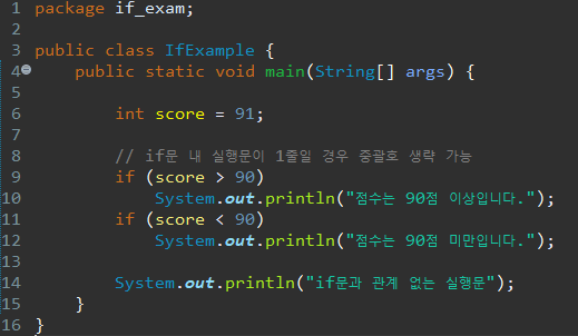 if문 내 실행문이 1줄일 경우에는 중괄호를 생략할 수 있다.