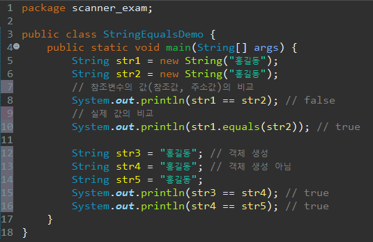 그리고 참조값이 다른 두 문자열은 '변수명1.equals(변수명2)'를 활용하여 실제 값의 비교가 가능하다.