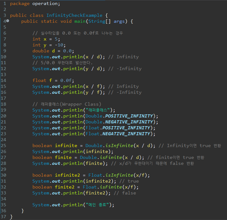 boolean 변수명 = 데이터 타입.isInfinite(); → 해당하는 값이 Infinity이면 true 반환